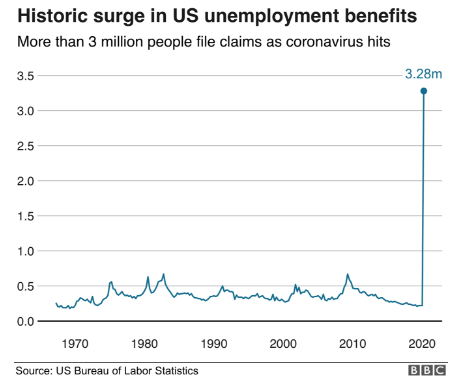 Unemployed Surge: Unemployment rates increased heavily when businesses closed/scaled back operations, reaching levels from the Great Depression. The graph to the right shows the dramatic change once the virus took hold of the country.